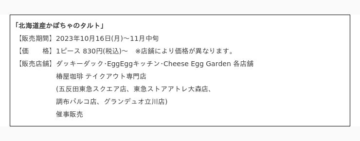 「椿屋珈琲」などを展開する東和フードサービス株式会社(本社:東京都港区/代表取締役社長CEO:岸野 誠人)は、手づくりのケーキにこだわったカジュアルカフェ「ダッキーダック」にて、2023年10月16日(月)より「北海道産かぼちゃのタルト」を期間限定で販売いたします。