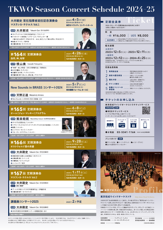 東京佼成ウインドオーケストラ(TKWO)は、「2024-25シーズンラインナップ」および「新指揮者等体制」を発表しました。今後5年間の方針として「つくる。つつむ。つなぐ。」を掲げ、楽団、ひいては吹奏楽界全体の発展に寄与すべく、新曲委嘱、定期公演数の順次増加、過去委嘱作品の再演、「楽芸員」作曲家中橋愛生氏を招聘してのトークイベント等の実施、マスランカ・チクルスに取り組んでまいります。正指揮者としての10年間を礎に、従来よりも一歩踏み込んだ「大井×TKWO」にご期待ください。