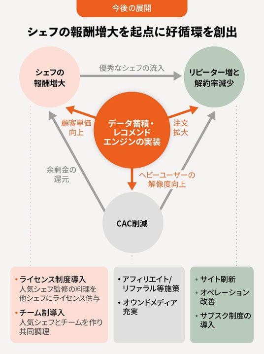 Kamanovaでは、目下の経営目標として、「質の高いシェフの流入・定着」を起点とした好循環を生み出し、より良い顧客体験を作りあげていくことに注力しています。シェフの報酬が増大することで、プラットフォームにより優秀なシェフが流入し、結果として売上高や継続率が向上するとともに、データが蓄積されていくことで、より有効な戦略を打ち出していくことできる、好循環を創出できると認識しています。