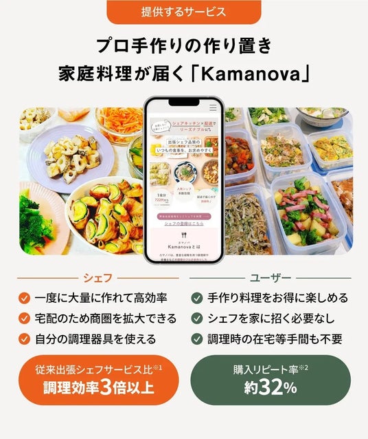 シェフは料理をサイトに掲載し、売れたらKamanovaが提供するシェアキッチンで料理を作り、料理は冷蔵便で配送されます。従来の出張シェフサービスと異なり、複数の家庭向けに一度に作ることができるため、シェフは収入を増やしやすく、ユーザー側も自宅に他人を招く必要がありません。
