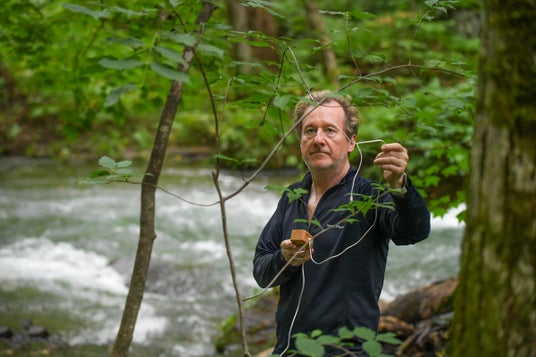 雨音を録音するニック・ウッド (Photo: Norico Wood)
