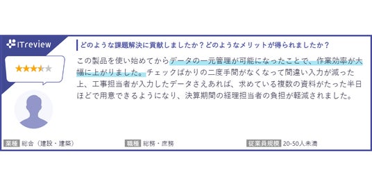 担当営業・SEの手厚いサポート、データの一元管理による経理担当者の業務負担軽減が評価され、「ITreview Grid Award 2024 Winter」ではERP(建設業向け)部門にて、顧客満足度が高い製品が称号を得られる「High Performer」に選出されました。