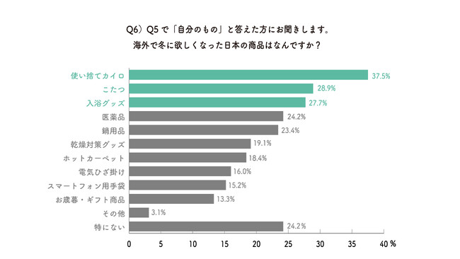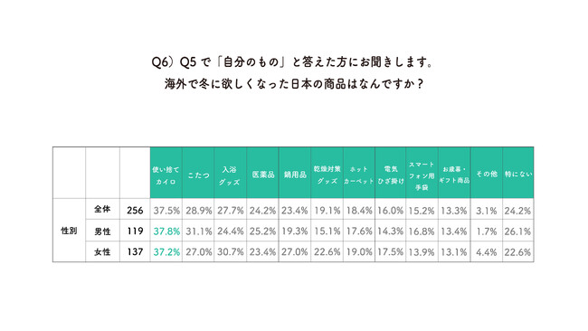 Q5で「自分のもの」と答えた人に「海外で冬に欲しくなった日本の商品」を聞いたところ、1位は「使い捨てカイロ」で37.5%の人が回答しました。使い捨てカイロは回答者の男女を問わず最も高かったため、海外では気軽に手に入らない防寒グッズであると言えそうです。