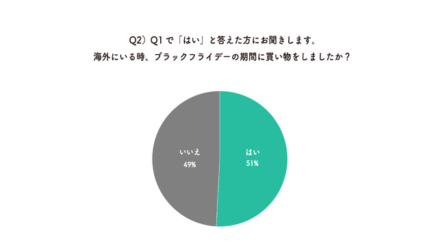 Q1で「はい」と答えた人のうち、2人に1人は「海外でブラックフライデー期間に買い物をしたことがある」と回答しました。海外ではブラックフライデーが一般的なイベントであり、かつ積極的に買い物をする機会として捉えられていると言えそうです。