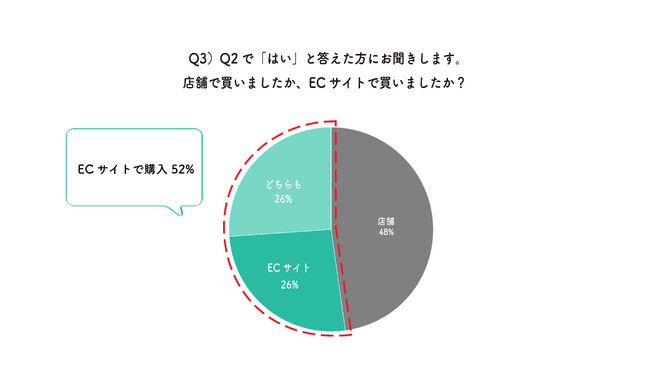 Q2で「はい」と答えた人のうち、ECサイトを利用して商品を購入したことがある人が合計52%と約半数にのぼることがわかりました。そのうち、ECサイトのみを利用して商品を購入した人は26%でした。