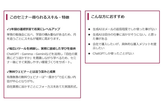 全12回のセミナーでは、ビジネスで活用が進む多様なAIツールについて体系的に学習でき、単発ウェビナーでは得にくい「継続的なレベルアップ」と「実務への応用視点」を重視している点が大きな特徴です。より多くの方のご参加いただくため1月31日実施分は参加費無料での開催となります。
