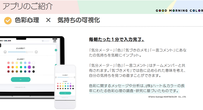 本会社が提供しているWebサービス「GOOD MORNING COLOR」では9月に導入企業数100社を突破、さらに感情マネジメント研修(EQ研修)も展開し、組織課題の解決を「自己表現」というユニークな切り口で取り組んでいる。