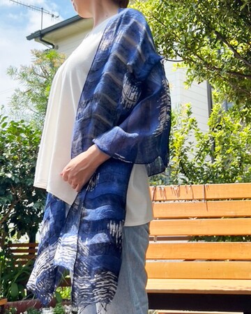 天然素材を中心に柔らかく織り上げた生地を、藍独特の深い色合いで染め上げた美しいストール。素材特有の光沢感と柔らかな肌触りが特徴の一つ。また、比較的静電気に強いレーヨン素材が含まれており、冬場でも安心して着用いただけます。
