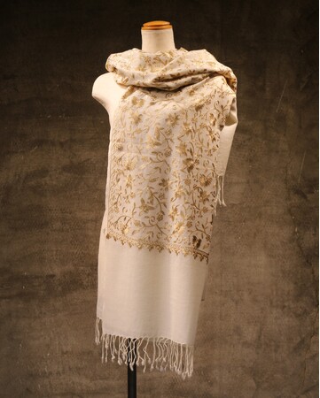 インド・カシミール地方の伝統工芸品、カシミール刺繍ストール。手刺繍手織りで一つ一つ丁寧に時間をかけて生み出されます。寒さが厳しい季節にぴったりのウール素材に、繊細で精巧な刺繍が施されており、さっと羽織るだけで高級感を演出してくれます。