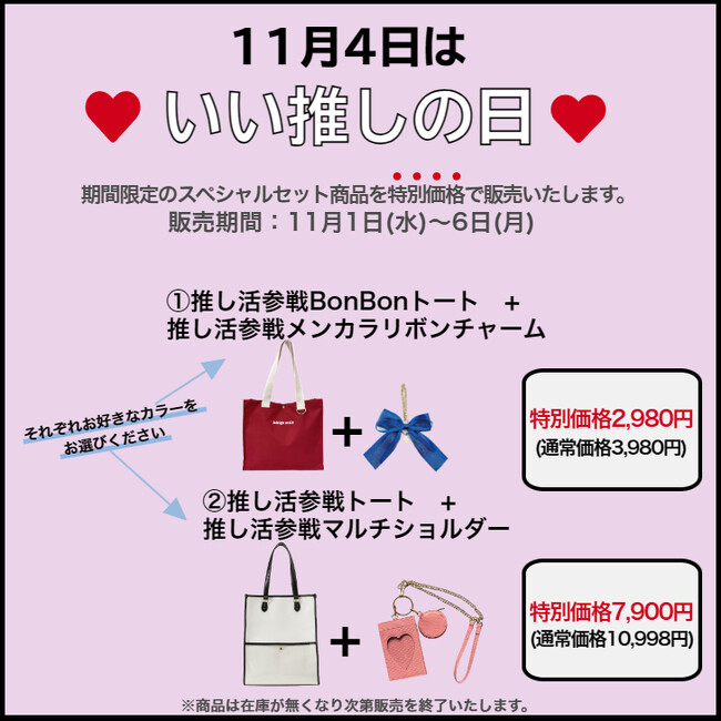 推し活グッズブランド「推しラボ」が11月4日のいい推しの日にちなんだキャンペーンを実施。購入者対象の推しバッグ選手権の初開催と、期間限定の特別セット商品を販売する。
