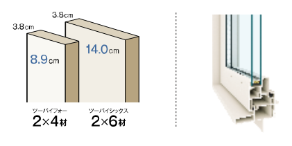 外壁の枠組に骨太な2×6材を仕様。耐震性が向上するだけでなく断熱性や遮音性もアップします。 樹脂フレームとLow-E複層ガラスで国内最高レベルの断熱性能。