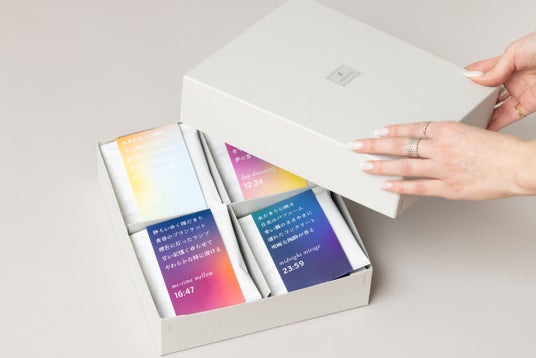 「07:13 sunrise serenade」「16:47 me-time mellow」「12:34 day dreaming」「23:59 midnight mirage」。日常にひそむ「特別な時間」とペアリングされた4つのオリジナルブレンドが、受け取った人の日常を特別に変えてくれます。美しい色合いのパッケージには五感を刺激する言葉がプリントされ、日記帳に新たな物語を綴るように、クリエイティブなコーヒー体験を楽しんでいただけることでしょう。