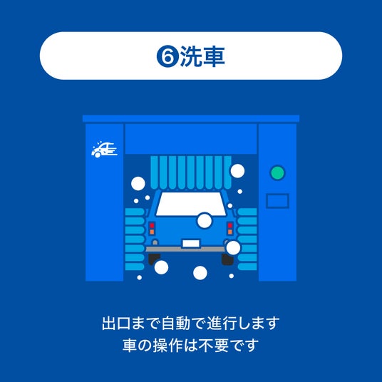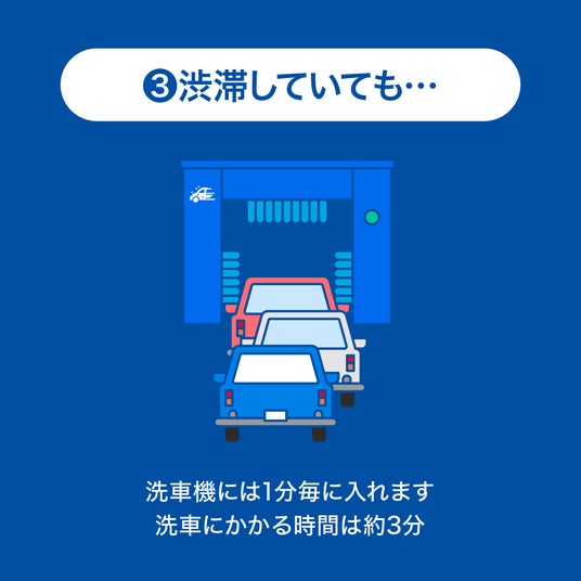 車内にいながらにして、わずか3分で洗車完了。1分間隔で次々と洗車が可能なので、待ち時間ゼロでスムーズにご利用いただけます。