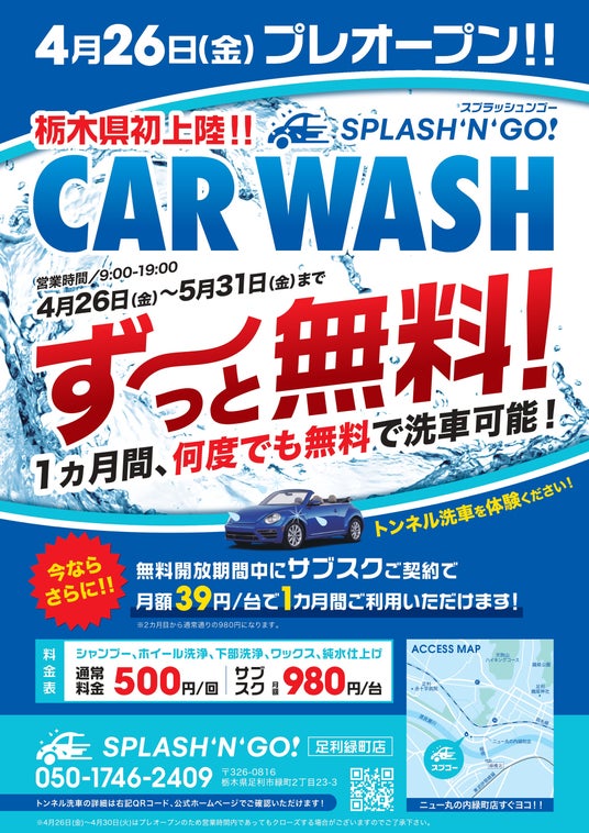 栃木県足利市に『SPLASH’N’GO!』が県外初進出、オープン記念キャンペーンとして4月26日~5月31日洗車無料開放&特別価格で洗車サブスクプランを提供!