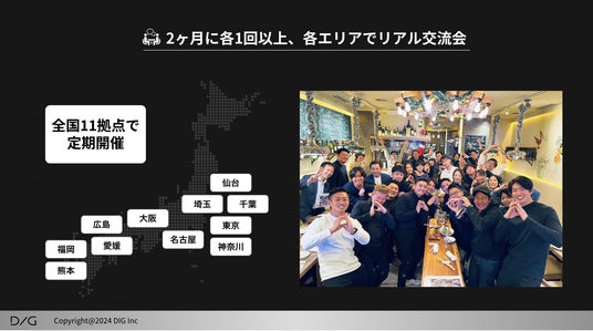 新たに2拠点の設立により、全国で11拠点となりました。地域の経営者やビジネスパーソンがカジュアルな環境で交流し、共に学び・成長できる場を全国に拡大し、DIGのMIssionである「全力で遊び、全力で学び、全力で仕事をする仲間を増やす」をさらに推進していきます。