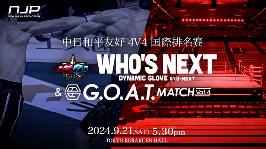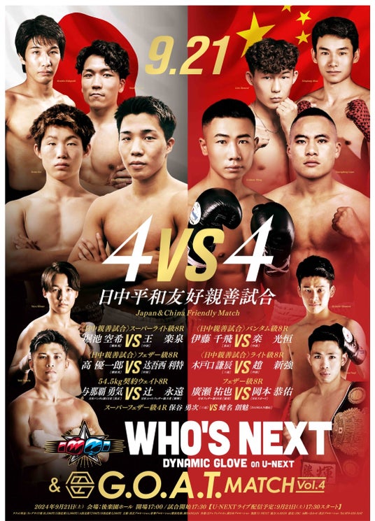 2024年9月21日(土)、後楽園ホールにて「WHO’S NEXT DYNAMIC GLOVE on U-NEXT Vol.23 & G.O.A.T.MATCH Vol.4」が開催されます。開場は17:00、第一試合は17:30から開始されます。本イベントのメインは、日中平和友好をテーマにした4対4の親善試合で、日本と中国の次世代強豪ボクサーたちが激突します。この大会は、真正プロモーション、帝拳プロモーション、株式会社DANGAN、横浜光株式会社、新日本プロモーションの共同主催によって実施されます。さらに、日中両国で実況放映される予定で、U-NEXTがライブ配信を行います。
