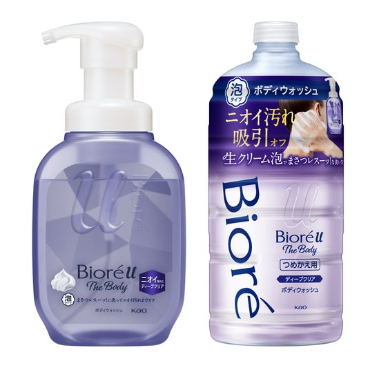 「ビオレu ザ ボディ 泡タイプボディウォッシュ ディープクリア」は、大人の気になるニオイの原因の一つが、皮脂汚れ(=ニオイ汚れ)であることに着目し、そのニオイの原因から洗い流すことのできる濃密な「ニオイ汚れ吸引オフ生クリーム泡」が特長の商品です。