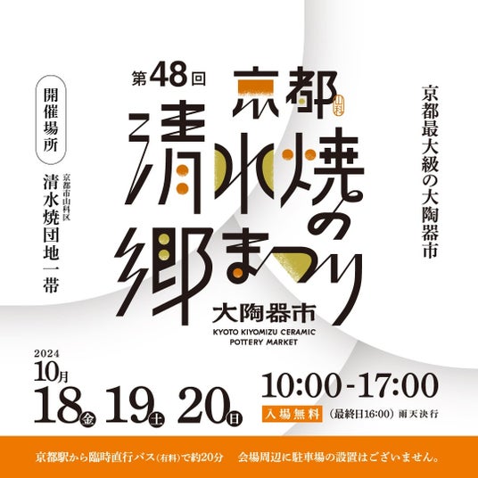 2024年10月18日(金)~20日(日)の日程で、「清水焼の郷まつり」(主催:清水焼の郷まつり実行委員会 所在地:京都市山科区)を開催いたします。一点ものの作品から日常で使いやすい器まで、清水焼の今を一望できるお祭りです。飲食ブースも多数出店し、ご家族で楽しめる伝統工芸ワークショップも充実しています。