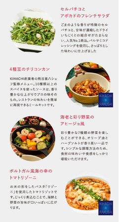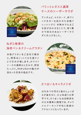 RAKUSAIのミールキットは、“楽して 楽しく 食卓を彩る”をコンセプトに、野菜のプロフェッショナルが厳選したこだわりの野菜が特長です。RAKUSAIでは、注文を受けた分だけを自社グループ工場で製造することで、野菜の新鮮さをそのままお客様へお届けしています。野菜のおいしさを引き出すカット技術など、青果物流通業のリーディングカンパニーであるデリカフーズグループのノウハウを最大限に活用し、料理のプロが考案した“おいしくて体に良いものを、楽して楽しく作れる”たっぷり野菜のミールキットです。食材のカットなど時間のかかる調理のしたごしらえを済ませているので、混ぜ合わせたり炒めたりするだけで、3分~20分で簡単に料理が作れます。