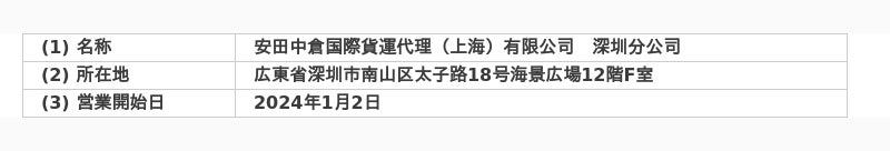 安田倉庫株式会社の連結子会社である安田中倉国際貨運代理(上海)有限公司は、2024年1月2日、中国・広東省の深圳市において、フォワーディング拠点となる「深圳分公司」を開設し、営業を開始いたしました。