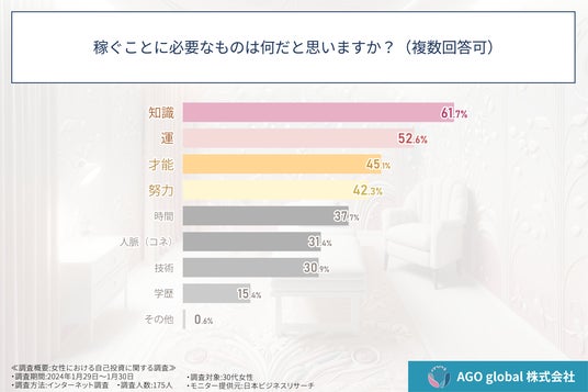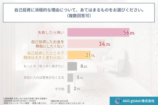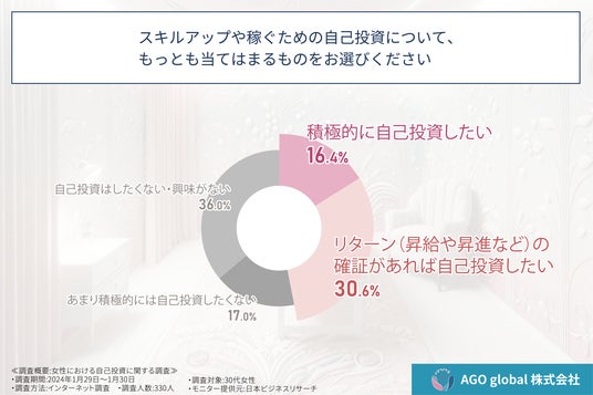 AGOセラピストスクール(本社:東京都港区、代表取締役:湯山 卓)は、この度、30代の女性330人を対象に、自己投資に関する調査を実施いたしましたので、お知らせいたします。