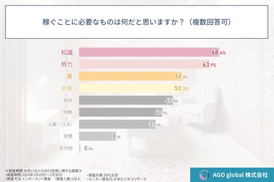 最も多かった回答が「知識」というのは、自己投資に消極的な人と同じ結果でしたが、次いで「努力」にも同数近い票が集まりました。自己投資に消極的な人と比べると、20%以上高い回答率となっています。