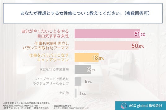 今回の調査では、理想の女性像として「自分がやりたいことをやる自由気ままな女性」や「仕事も家庭も両立しバランスの取れたワーママ」に多くの票が集まりました。