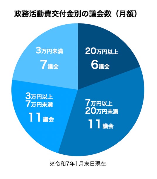 この実証実験には、政務活動費の交付額(月額)に応じて多様な規模の議会が参加しています。下記のグラフは、実証実験に参加または検討している議会を月額の政務活動費交付額別に分類したものです。