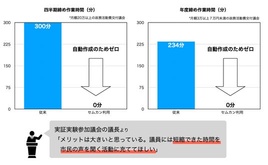 実証実験にご参加いただいた議会への調査では政務活動費の締め作業において、大幅な効率化が実現されました。また「予算要求までに実際に使えるサービスか試せたことが非常に助かった」という声をいただいています。