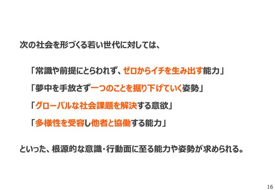 経済産業省が令和4年5月に「未来人材ビジョン」を発表しました。日本社会が直面する課題を踏まえ、急速な技術革新や社会構造の変化に対応するため、どのような人材が必要とされるかを明確化し、具体的な育成方針を提案しています。その中では特に「常識や前提にとらわれず、ゼロからイチを生み出す能力」「夢中を手放さず一つのことを掘り下げていく姿勢」「グローバルな社会課題を解決する意欲」「多様性を受容し他者と協働する能力」が重要と提示されました。