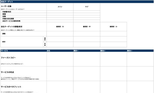 下記内容に沿って、自社・競合調査を進めてシートに記載してください。