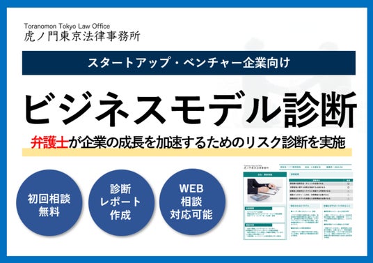 虎ノ門東京法律事務所(所在地:東京都港区虎ノ門3丁目18−16 虎ノ門菅井ビル7F)は、革新的なビジネスモデルで事業を推進する起業家の皆様に向け、この度、「ビジネスモデル診断」サービスを新たに開始したことをお知らせいたします。