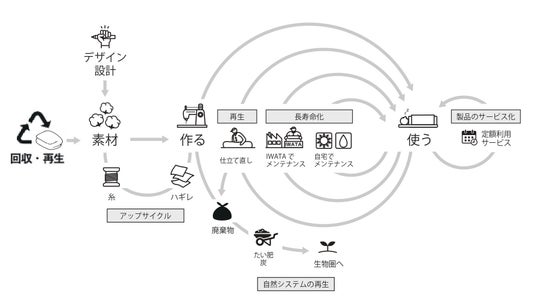 イワタでは「作る」→「使う」→「棄てる」という従来の消費の流れではなく、循環型のサイクルを提案しています。「作る」「使う」「棄てる」の各段階で資源の消費と廃棄物の発生を減らしながら、その循環を通して新たな製品やサービスを生み出す「サーキュラーデザイン」を推進しています。世界的な資源不足、環境破壊が危惧されるなか、イワタは貴重な資源の有効活用を促し、地球環境の保護に貢献したいと考えています。人と環境の未来のため、私たちが今できることを考えながら、持続可能な社会の実現に向けた取り組みを行います。
