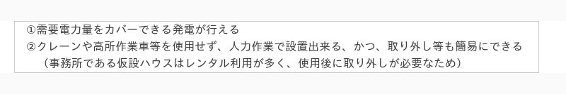 1.:建設現場での必要電力に応じた太陽光パネルの適正設置数・安定電力量算出