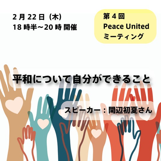 NPO法人Connection of the Children:CoC(神奈川県横浜市西区)は、平和に向けての様々な道を知り、自分の道を見つけるプラットフォーム「Peace United」の一環で、2月22日(木)夜、平和について考え、自分の考えを共有し、平和に貢献する方法を集めるイベントを開催します。
