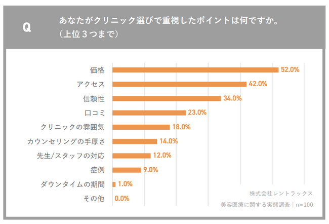 Q.あなたがクリニック選びで重視したポイントは何ですか。(上位3つまで) (n=100)