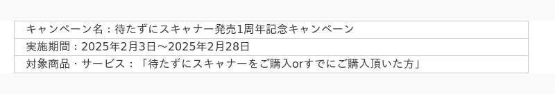 [待たずにスキャナー発売1周年記念キャンペーン]:キャンペーン期間中に特別なアイテムをプレゼントし、利便性向上を目指します。