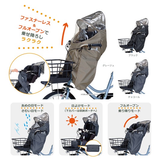 雨の日は、レインカバーの着脱が面倒、ファスナーの開閉に時間がかかる、子どもの乗せ降ろしがしづらくなるなど、パパママから寄せられた声を元に、業界初(※)のアレンジルーフや、ファスナーレスカバーを搭載したリヤチャイルドシート用レインカバーを開発しました。各チャイルドシート専用の取付けアタッチメントを備えた設計にすることで、高い操作性とフィット感も実現しました。「ファスナーレスで、突然の雨もサッとルーフを下げるだけなのでノンストレス」「乗せ降ろしが格段にラク」「専用設計だから扱いやすく取り付けも簡単」など好評の声が多かったことから、初めて同機能を搭載した専用設計のフロントチャイルドシート用を開発しました。今後も自転車チャイルドシートメーカーだからこそできる専用設計でより快適性を追求したいと考えています。