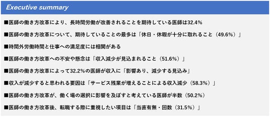 株式会社リクルートメディカルキャリア(本社:東京都千代田区、代表取締役:高崎 透、以下リクルートメディカルキャリア)は、メドピア株式会社(東京都中央区、代表取締役社長 CEO:石見 陽、以下メドピア)と共同し、メドピアの運営する医師専用コミュニティサイト「MedPeer」に登録する医療機関に勤務する医師2,045人を対象に、医師の働き方改革に関する意識についてアンケート調査を実施しました。本リリースでは、「医師の働き方改革」に対する医師の期待と不安について解説します。