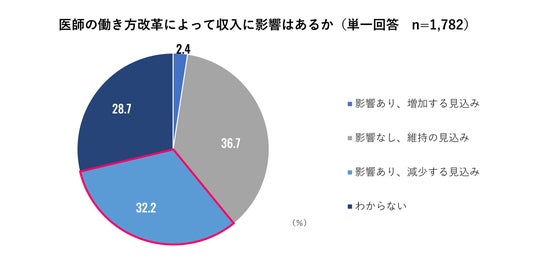 医師の働き方改革によって32.2%の医師が収入に「影響あり、減少する見込み」