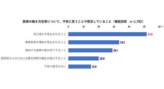 医師の働き方改革への不安や懸念は「収入減少が見込まれること(51.6%)」
