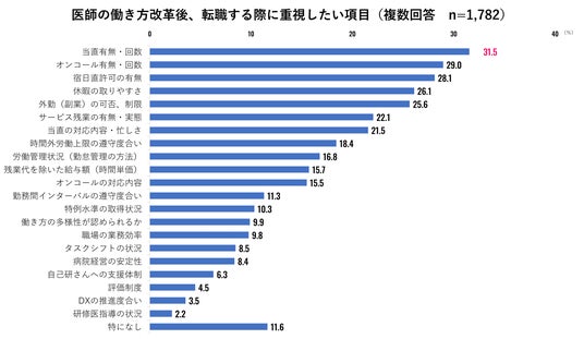 医師の働き方改革後、転職する際に重視したい項目は「当直有無・回数(31.5%)」