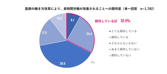医師の働き方改革により、長時間労働が改善されることを期待している医師は32.4%