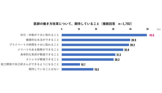 医師の働き方改革について、期待していることの最多は「休日・休暇が十分に取れること(49.6%)」