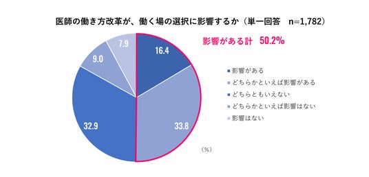 医師の働き方改革が、働く場の選択に影響を及ぼすと考えている医師が半数(50.2%)