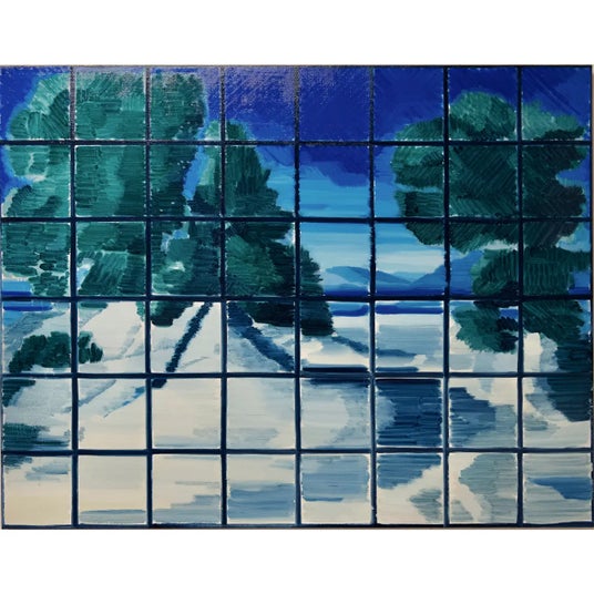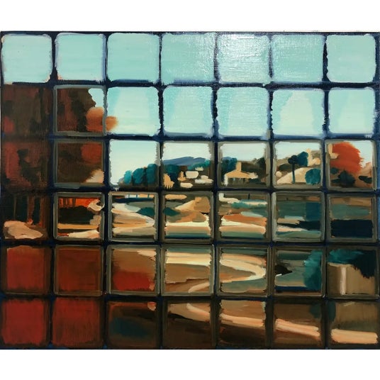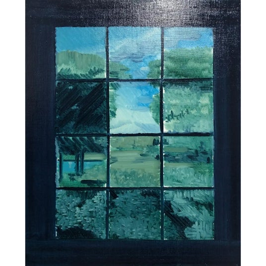 今回の展示の作品はほとんどがニコラ・プッサンの風景画をモチーフに描いています。彼の作品を見ていると、自分の幼い頃に体験した、暗い部屋の窓から山の色の光が入ってきて部屋全体が薄っすら緑色になった光景を思い出します。なので彼の風景画をその山の光のように、もしくはカメラオブスクラによって壁に映し出された光としてみたて、その光をなぞるように描きました。カメラオブスクラとは暗い部屋の小さな穴から壁に外の光景が映し出される装置です。目が見える原理もその装置と同じで、光が眼底に映し出されています。描いている最中にそのことが頭の中をよぎり、だんだんと目の中の壁にその光を描いているように感じました。去年以下のようなステートメントを描きました。「狭い場所を出て広い所に行きたいと思っていましたが、身体が邪魔だと感じました。森の中を迷うにも、広い海の上で漂うにも身体が傷つくことを気にしてしまう。そんな思い通りにいかない体にうんざりしていたら『遠くに投げる』ことを思いつきました。体を遠くに投げたら広い平野に落ちて転がったり、広い海にポチャンと漂ったりするのではないだろうかと考えました。投げられた身体が徐々に塵になって、目という澄んだレンズだけが残って、光を収集し、収集したそれらが星となって消える前に絵という墓に納めています。」今回の展示と制作はこの続きをしています。