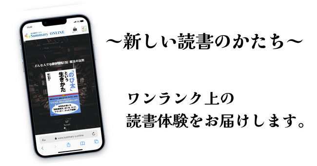 サマリーオンラインは、時短読書、本の購入前に内容を知ることでミスマッチを防ぐ「新しい読書のかたち」、新しい本との出会いなどを、誰もが楽しめるようにという思いで作られたサービスです。