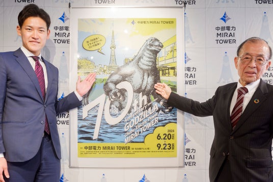 6月20日から開催しますイベント期間中は、中部電力MIRAITOWERの南側に広がるHisaya-odori Parkミズベヒロバにゴジラが出現したり、展望台に名古屋の街とゴジラの70年の歩みを重ねながら楽しめるARが登場するなど、さまざまな企画を用意しています。また、記念に残る限定コラボグッズの販売を予定しています。 5月17日に開催した記者会見には名古屋テレビ塔株式会社 代表取締役社長 大澤和宏と東宝株式会社 ライツ事業部 ゴジラルーム ライセンスグループ 田渕 恭兵さんが登壇しました。