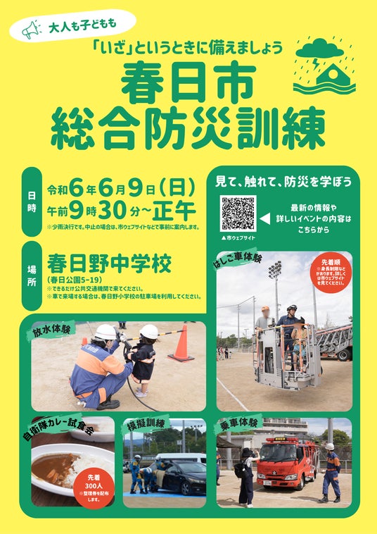 市や防災関係機関、自主防災組織が連携し、総合防災訓練を実施します。関係機関による救出・救護訓練や消火訓練を行います。また、子どもが楽しめるコーナーや、自衛隊などの車両展示、炊き出し訓練のカレー試食(先着300食)もあります。家族そろって見学・体験に来てください。