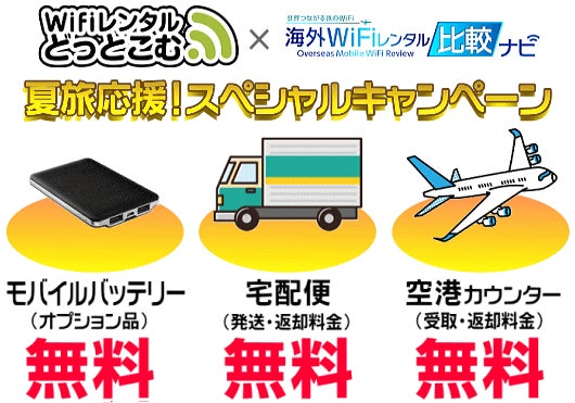 夏の旅行や一時帰国に最適な国内WiFiレンタルの「WiFiレンタルどっとこむ」が、モバイルバッテリーや往復の宅配送料や空港受渡手数料が無料となる特別キャンペーンを実施